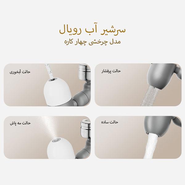 - دارای 4 حالت پردازش آب\n- دارای ولوم تنظیم آب\n- قسمت اتصال به شیر روشویی از آلیاژ برنج می باشد