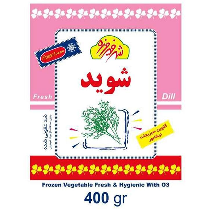 وزن خالص محصول: 400 گرم\r\n\r\nمحتویات بسته: شوید\r\n\r\nروش مصرف: پس از خروج از حالت انجماد مصرف نمایید\r\n\r\nدمای نگهداری: منفی 18 درجه سانتی گراد\r\n\r\nمحصولات در لفاف شفاف دو لایه و شیری دو لایه بسته بندی می شوند که باعث حفظ عطر و طعم بهتر مواد می شود.\r\n\r\nطبق استانداردهای روز دنیا بهترین روش ضدعفونی و بسته بندی سبزیجات به جای استفاده از مواد شیمیایی و کلر، استفاده از گاز ازن و پلاستیک سه لایه سفید (ضد نور) می باشد که هیچگونه عوارض جانبی برای انسان ندارد.\r\n\r\n