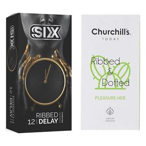 مشخصات فنی کاندوم چرچیلز مدل Pleasure Her بسته 12 عددی به همراه کاندوم سیکس مدل تاخیری شیاردار بسته 12 عددی