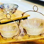 ظروف چهار تکه سرامیکی و پایه برنزی رنگ ثابت شامل شیرینی خوری و میوه خوری و اجیل خوری و شکلات خوری