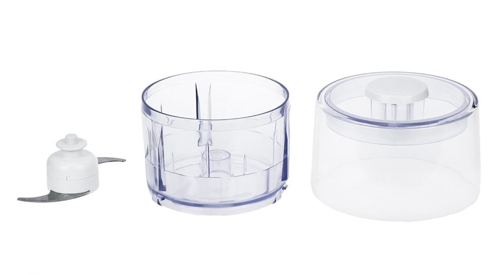 تیغهی مخلوطکن چهار پره\r\nتیغهی خردکن دوپره\r\nکارکرد فشاری\r\nظرفیت خردکن برای خشکبار 150 گرم و برای گوشت 200 گرم\r\nقابلیت خرد کردن تکه یخهای کوچک (حداکثر 2.5×2.5 سانتیمتر)\r\nپایههای ضدلغزش