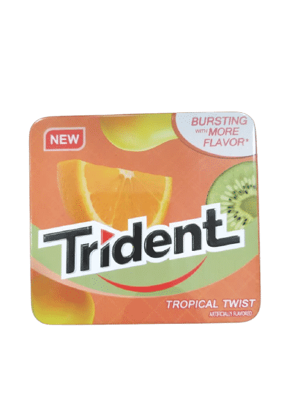 مشخصات فنی ادامس trident تریدنت جعبه فلزی با طعم پرتقال و کیوی 35 گرمی