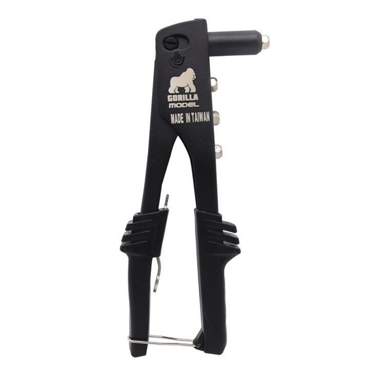 - انبر پرچ گوریلا \r\n- ساخت تایوان\r\n- وزن :570 گرم\r\n- دسته روکش دار ضد لغزش و تعریق\r\n- دارای آچار تعبیه شده داخل دسته جهت تعویض سریها (نازلها) \r\n- دارای فک داخلی سه تکه جهت گرفتن مستحکم میخ پرچ \r\n- دارای بدنه ضخیم با ضخامت 2 میلیمتر \r\n- دارای قفل کن جهت بسته نگه داشتن انبر در زمان عدم استفاده از آن \r\n- محل قرار گیری سری: دسته جلویی \r\n- دارای 4 سری به ابعاد 2.4 و 3.2 و 4.0 و 4.8 میلیمتر
