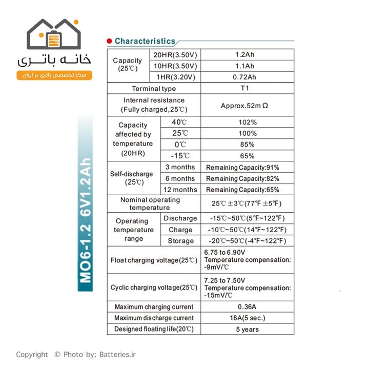 مشخصات فنی باطری سیلد اسید 6 ولت 1.2 آمپر moricell