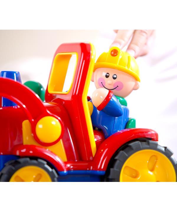 به وسیله 3 عدد باتری کار می کند با فشردن سر عروسک ، صدای بولدوزر شنیده می شود چراغ های ماشین با فشردن بوق میان فرمان روشن می شود. بیل مکانیکی با فشردن اهرم بالا و پایین می روند. دارای یک نوار بکسل برای اتصال به چرخ دستی یا ماشین های دیگر تقویت قدرت لامسه و حرکتی و شنوایی کودک