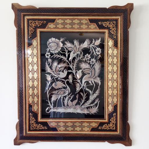 تابلو قلم زنی روی مس با قاب خاتم کاری صلیبی نفیس ( سایز 54 در 64 سانتی متری )