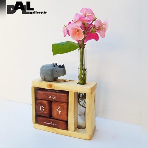تقویم چوبی گلدان دار با کرگدن چوبی 2 عدد مکعب 3 عدد مکعب مس...