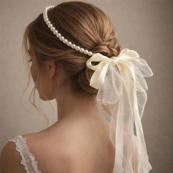 تل سر مرواریدی عروس با پاپیون حریری و تور ظریف