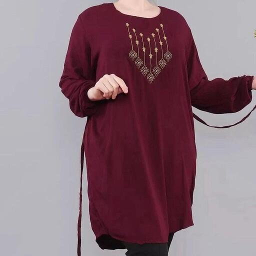 تونیک نخی زنانه یقه سنتی بدون ابرفت شسته شده شش رنگ قرمز خردلی توسی بنفش زرشکی فری مناسب تا 50کد651