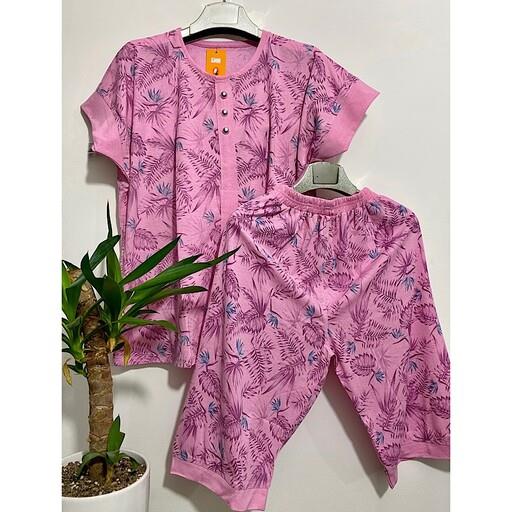 تیشرت و شلوارک قواره دار ویسکوز اعلا تمام چاپ برگ سه دکمه دارای رنگ بندی فری سایز از سایز 44تا52