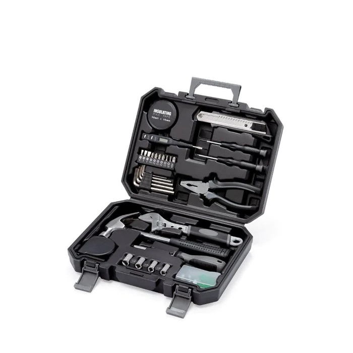 آچار فرانسه, بوشینگ در سایزهای 7 الی 10 میلی متر, چکش به همراه ری میخ کش, دو عدد پیچ گوشتی تک کاره قلمی, کاتر تیغه 45 درجه, متر فلزی 3 متری, نوار الکتریکی, ولت متر, یک عدد پیچ گوشتی جغجغه ای به همراه 10 سری آهنربایی از جنس فولاد S2