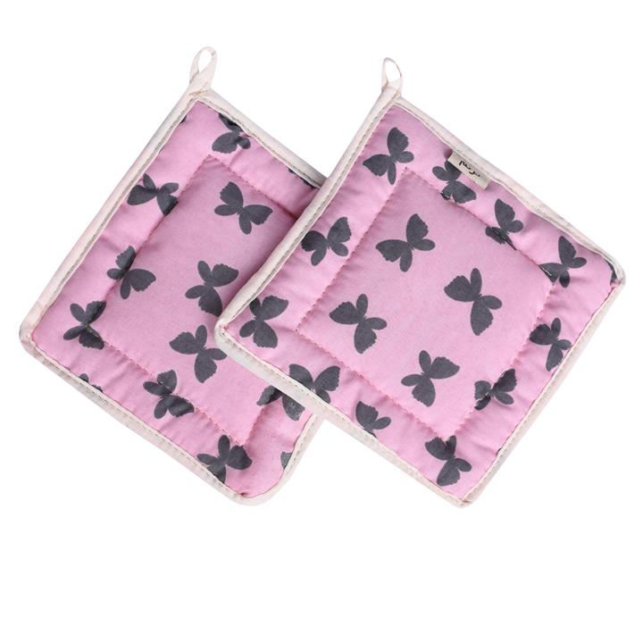ضخيم و پر شده با الياف پلي استر \r\nمقاوم در برابر حرارت \r\nدورتا دور دستگيره با پارچه متقال پنبه ايي نواردوزي شده است\r\nداراي قلاب براي آويزان كردن\r\nداراي دوختهای میانی جهت جلوگيري از جابهجا شدن و تکان خوردن الیاف داخلی آن\r\nاستفاده از پارچه مرغوب با طول عمر بالا\r\nدقت در الگو و دوخت تميز \r\nمناسب براي قابلمه و تابه و سيني فر و ..\r\nنكته مهم در خريد اين محصول، نشان اصالت محصولات ترنم مي باشد كه بر روي كالا دوخته شده و در تصاويرمشخص است .عدم وجود اين نشان به منزله تقلبي بودن كالا مي باشد