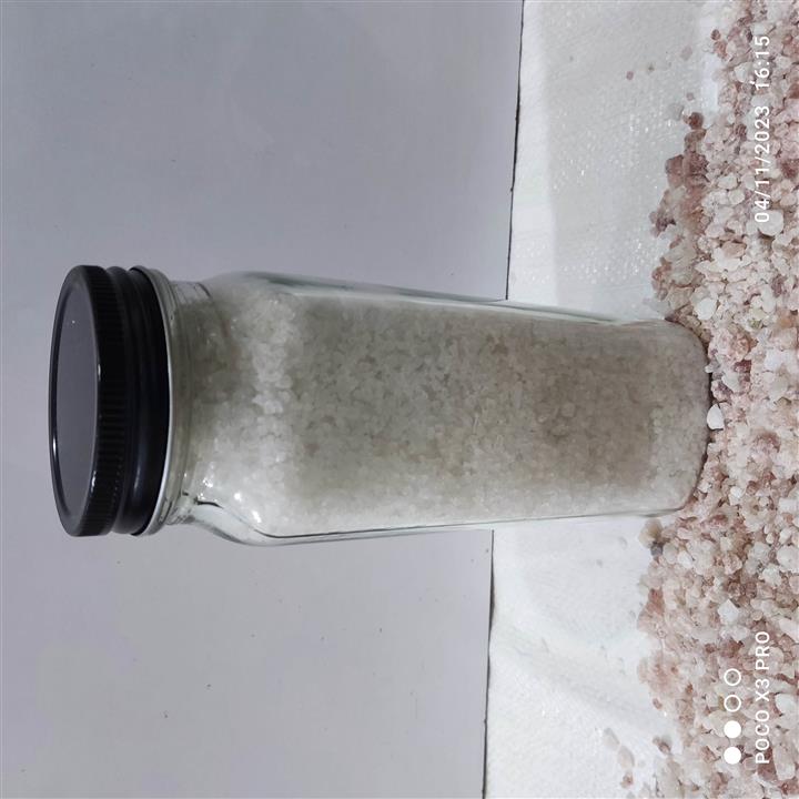مشخصات فنی دلنمک جهرم و نمک صورتی یک کیلویی در ظرف شیشه ای چهارگوش با درب کانتینری فلزی دهانه 68 میلیمتر