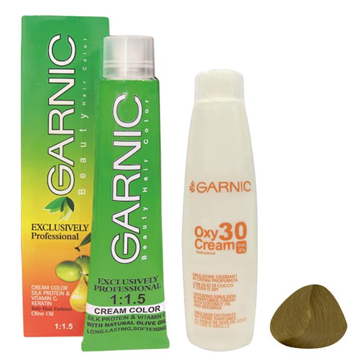 رنگ مو گارنیک شماره 6.3 حجم 120 میلی لیتر رنگ بلوند زیتونی تیره به همراه اکسیدان گارنیک مدل 20vol شش درصدی حجم 180 میلی لیتر