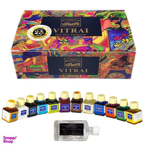 بسته شامل رنگهای: سفید، نارنجی، آبی آسمانی، آبی پررنگ، سبز کمرنگ، سبز پررنگ، بنفش، قهوهای، وارنیش، قرمز، زرد، مشکی
