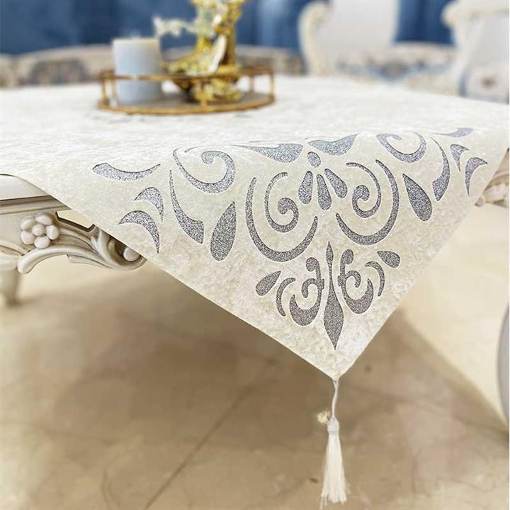رومیزی مربعی طرح داماس مخمل کرم چرم نقره ای اکلیلی