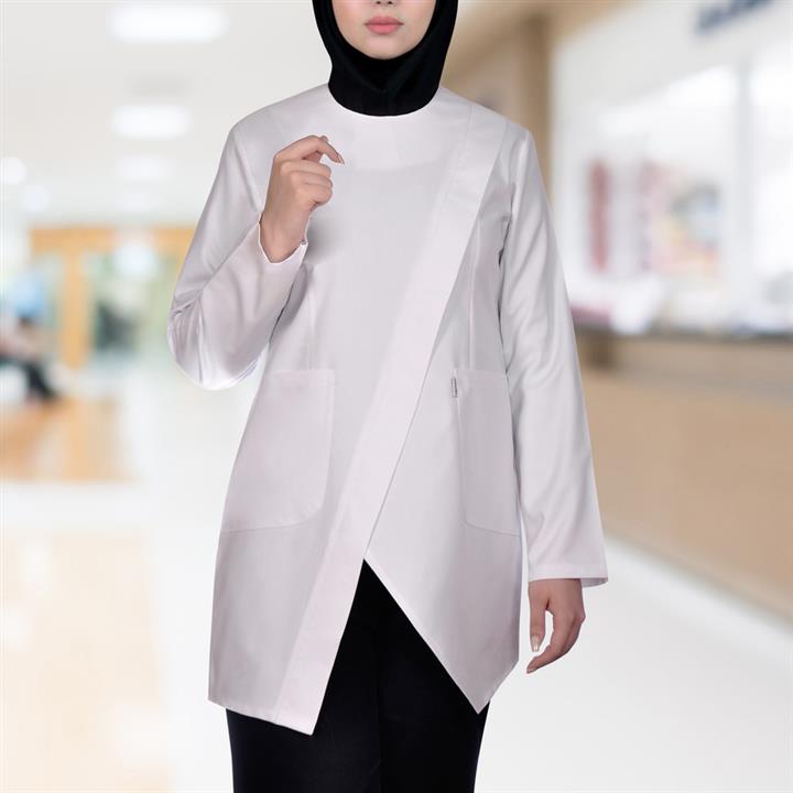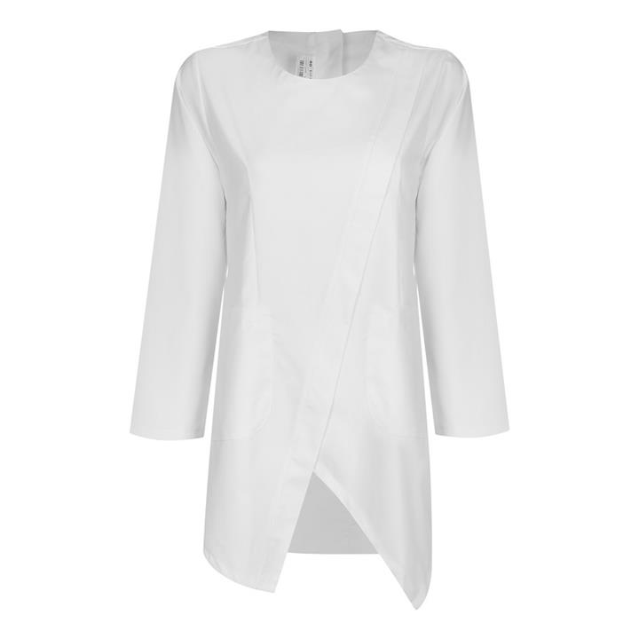 اسکراب سفید جلوبسته - پارچه کجراه - جلو بدون دکمه - دارای یک دکمه پشت گردن - دارای دو جیب پایین