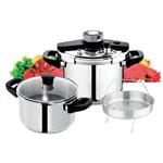 جنس بدنه استیل 18.10 با آلیاژ ۳۰۴دسته ها از نوع پلاستیکی دو دستهدارای سوپاپ قفل ایمنیشیشه پیرکس قابل استفاده روی هر دو قابلمهسیستم درب آسان بازشودرجه دمای بخار : ۲۵۰ فارنهایتاستیل ضد زنگکف چدن ۴ لایه با قابلیت پخش حرارت به صورت یکنواختضخامت بدنه 4 میل استیلقابل استفاده جهت پخت تحت فشار / بخارپز تحت فشار / بخارپز بدون فشار / دیگ قابلمه ای / آبکش درون دیگ جهت تهیه و پخت خورشت ، گوشت ، ماکارونی و بسیاری دیگر