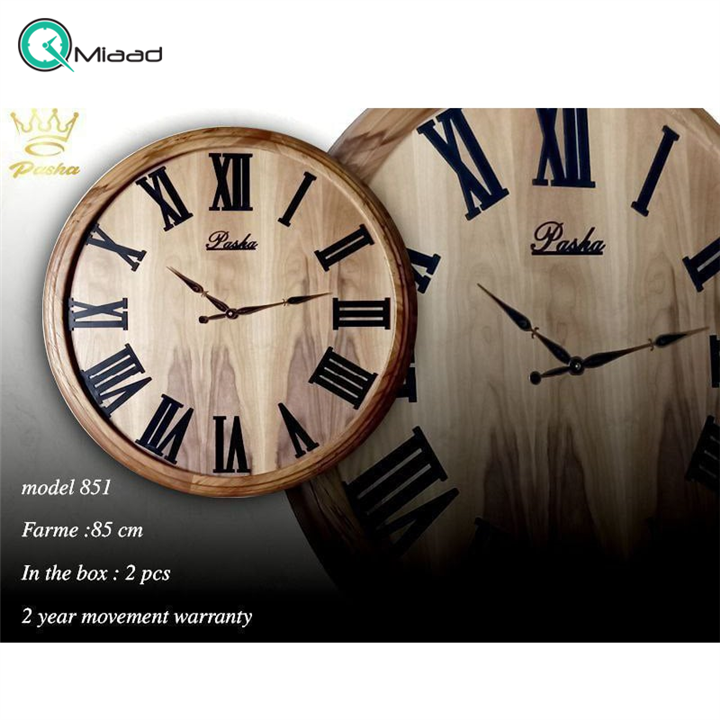 ساعت دیواری پاشا، ساعت دیواری با بدنه چوب طبیعی راش جنگلی، موتور آرامگرد، اعداد رومی و طرح رگ های چوب روی صفحه ساعت، سایز 85 مدل pasha 851