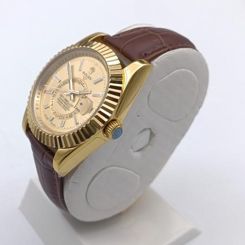 ساعت رولکس اسکای دویلر چرمی طلایی صفحه طلایی مردانه