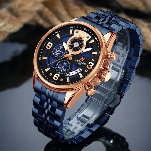 ساعت مردانه فلزی مارک ریوارد مدل 81011 سه موتوره فعال رنگ ثابت کیفیت عالی تقویم دار حک مارک روی قفل دارای جعبه و پاکت اصلی کد 1922441