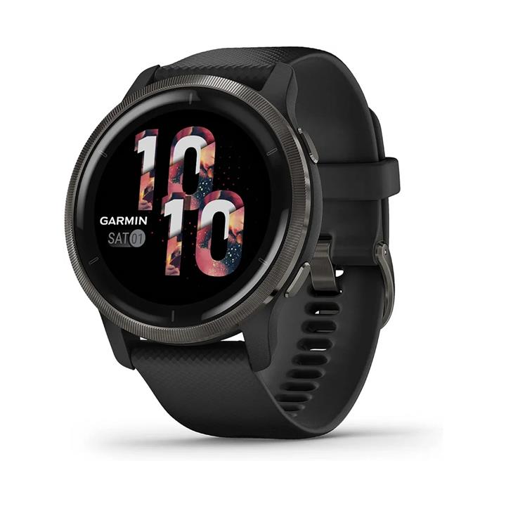 ساعت هوشمند گارمین مدل Venu 2 دارای قابلیت های صفحه نمایش رنگی، صفحه نمایش لمسی، کنترل موسیقی (Music Player)، کنترل سطح اکسیژن خون، قابلیت تغییر طرح ساعت یا تم، ضد آب بند سیلیکون
