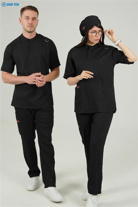 ست اسکراب پزشکی یقه دیپلمات مشکی پارچه لاکرا، خنک و سبک
