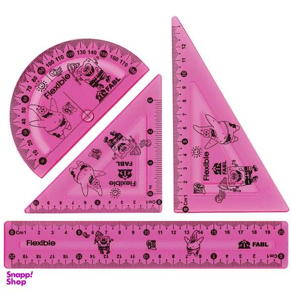 – محتوی یک خطکش، دو گونیا 45 درجه و یک نقاله – ساخته شده از پلاستیک نرم (ژلهای) – کاملاً بهداشتی – با طرح پاتریک و باب اسفنجی – مشخصات خطکش: – 15 سانتیمتری – دارای درجهبندی سانتیمتر – با فرورفتگی در قسمت میانی برای در دست گرفتن و کاربرد آسانتر – مشخصات گونیا: – 45 درجه با 10 سانتیمتر طول و درجهبندی سانتیمتر و اینچ – 30 درجه با 13 سانتیمتر طول – مشخصات نقاله: – 180 درجه