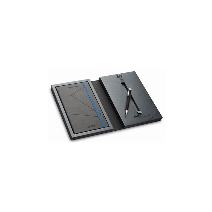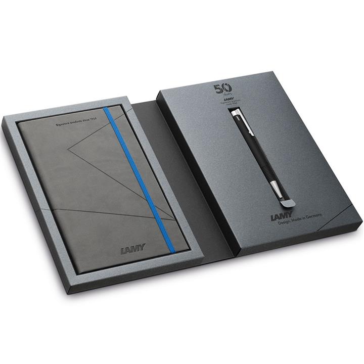 - ساخت آلمان\r\n - طراحیشده به مناسبت پنجاهسالگی لامی\r\n - محتوی یک خودکار و یک دفتر یادداشت\r\n - مشخصات خودکار: \r\n - مدل +Special Edition LAMY logo M\r\n - با پوشش نرم\r\n - با کارتریج جوهر LAMY M 16 M\r\n - با طرح برجسته روی محل قرارگرفتن انگشتان، برای کاربرد آسانتر \r\n - دارای گیرهی فلزی برای حمل در جیب\r\n - طول خودکار: 13.5 سانتیمتر\r\n - وزن خودکار: 18 گرم\r\n - مشخصات دفتر:\r\n - دارای 240 صفحهی کاغذ خطدار هشتادگرمی\r\n - با 24 صفحه توضیح در مورد لامی به زبان انگلیسی\r\n - دارای جلدی از چرم مصنوعی، نبوک با حکاکی (بدون استفاده از جوهر)\r\n - با بست و جای خودکار کشی و نشانگر صفحهی آبیرنگ\r\n - دارای یک جیب کاغذی در قسمت داخلی جلد پشتی\r\n - - ابعاد دفتر: 21 × 11 سانتیمتر\r\n - وزن دفتر: 342 گرم\r\n - ابعاد بستهبندی: 5 × 16.5 × 24.5 سانتیمتر\r\n - وزن بستهبندی: 533 گرم