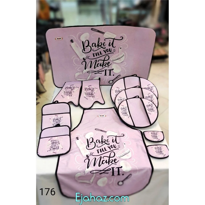 11 پارچه شامل : 2 عدد دمکنی + 1 عدد نم گیر ظرف + 1 عدد پیش بند + 1 عدد دستکش فر + 2 عدد دستگیره قلبی + 2 عدد دستگیره کوچک قابلمه