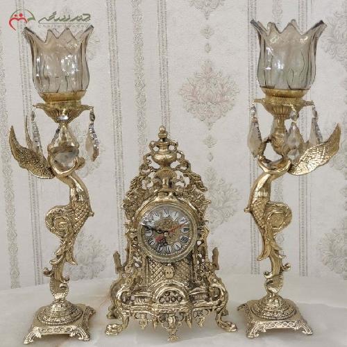 ست ساعت و شمعدان رومیزی طرح فرشته با بدنه ی تمام برنزی پر کار و رنگ فورتیک درجه یک کد 424