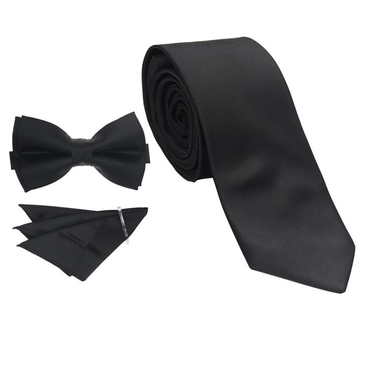 رنگ مشکی ساده\r\nدوخت دست دوز در پشت کراوات\r\nآستر دوزی مرغوب در کراوات\r\nکراوات 150 در 7 سانت\r\nدستمال جیب دور دوزی شده\r\nدستمال جیب 24 در 24 سانت\r\nپاپیون ساتن دوبل\r\nپاپیون با بند پارچه ای و قزن\r\nپاپیون 6 در 12 سانت