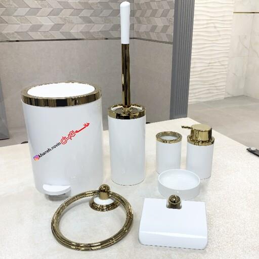 ست 7 پارچه سرویس بهداشتی هارمونی مدل روشا رنگ سفید طلایی درب پدالی و بادبزنی