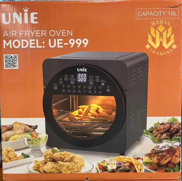 سرخ کن یونی 16 لیتری مدل UE 999:\nداراي قابليت : يخ زدايی ، توست ، گريل ، پيتزا ، كيك ، ميوه خشك كن ، جوجه گردان ، دونر و… ، ظرفيت : 16 ليتر ،دارای المنت بالا و پایین،\n توان : 1700 وات ، داري المنت بالا و پايين با قابليت تنظيم ، 16 برنامه پيش فرض پخت به همراه برنامه زمان و دماي دلخواه ،ظرفیت سبد داخلی: مخصوص هواپز به ظرفيت 8 ليتر ، جنس بدنه و داخل: استيل ، با قابليت تميز شوندگی آسان ، درب شيشه ای دوجداره و ضد شوك گرمايی ،دارای لامپ داخلی ،صفحه نمايش بزرگ لمسي ، دارای پخت تركيبي و جداگانه ( هواپز و اَون توستر ) ، یکی از ویژگی های برجسته سرخ کن یونی مدل UE 999، ظرفیت بزرگ آن است. این دستگاه با حجم 16 لیتر ، به شما این امکان را می دهد تا غذاهای حجیم مانند مرغ کامل، پیتزا های بزرگ یا حتی چندین تکه گوشت را به راحتی آماده کنید. چنین ظرفیتی برای خانواده های پرجمعیت یا کسانی که به مهمانی های خانگی علاقه دارند، یک مزیت بزرگ به شمار می رود.\nسرخ کن یونی UE 999 از توان 1700 وات واقعی بهره می برد که این قدرت بالا تضمین کننده پخت سریع و یکنواخت غذاها است. مهم نیست که بخواهید سیب زمینی سرخ کنید، کیک بپزید یا حتی مرغ گریل کنید؛ این دستگاه عملکردی بی نقص را ارائه می دهد. همچنین، وجود المنت های بالا و پایین با قابلیت تنظیم جداگانه، امکان پخت یکنواخت را فراهم می کند. این ویژگی به شما کمک می کند تا کنترل دقیقی بر روی فرآیند پخت داشته باشید و غذاهایی با طعمی ایده آل تهیه کنید.\nسرخ کن همه کاره یونی UE 999، تنها یک سرخ کن ساده نیست؛ این دستگاه مجموعه ای از امکانات را در خود جای داده است. قابلیت هایی همچون یخ زدایی، توست، گریل، پخت پیتزا و کیک، خشک کردن میوه، جوجه گردان و دونر، این سرخ کن را به یک وسیله همه کاره تبدیل کرده است. با این امکانات، شما می توانید طیف گسترده ای از غذاها و دسرها را با این دستگاه آماده کنید، بدون اینکه به ابزارهای اضافی نیاز داشته باشید.یکی دیگر از ویژگی های برجسته سرخ کن رژیمی یونی 16 لیتری، طراحی مدرن و کاربردی آن است. این دستگاه با بدنه ای از جنس استیل ضد زنگ ساخته شده که هم دوام بالایی دارد و هم به راحتی تمیز می شود. درب شیشه ای دوجداره و ضد شوک گرمایی این امکان را به شما می دهد که فرآیند پخت را به طور کامل مشاهده کنید، بدون اینکه نیازی به باز کردن درب دستگاه باشد. همچنین، وجود صفحه نمایش بزرگ لمسی، کنترل دستگاه را برای شما بسیار آسان کرده است.یکی از مزایای خاص این دستگاه، وجود پخت ترکیبی هواپز و اون توستر است. این ویژگی به شما امکان می دهد تا غذاهایی با بافتی ترد و مغز پخت داشته باشید. همچنین، اسپری روغن با کیفیت از جنس شیشه، به شما کمک می کند تا غذا های کم چرب و سالم تری تهیه کنید. علاوه بر این، این سرخ کن رژیمی یونی 16 لیتری مجهز به چراغ داخلی است که دید بهتری از داخل دستگاه در حین پخت به شما می دهد.