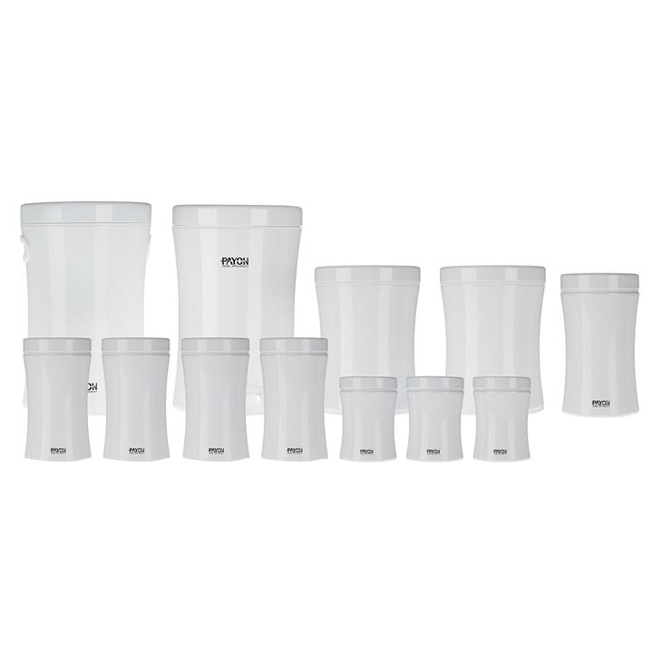 - 2 عدد بانکه سایز 1:\r\n- ابعاد: قطر 17.5 و ارتفاع 23.5 سانتیمتر\r\n- وزن ظرف: 730 گرم \r\n\r\n- 4 عدد بانکه سایز 2:\r\n- تعداد: 4 عدد \r\n- ابعاد: قطر 11 و ارتفاع 29 سانتیمتر\r\n- وزن: 370 گرم \r\n\r\n- 3 عدد بانکه سایز 3:\r\n- تعداد: 3 عدد \r\n- ابعاد: قطر 11 و ارتفاع 16 سانتیمتر\r\n- وزن: 315 گرم \r\n- کف بانکهها دارای لایهای لاستیکی برای جلوگیری از سُر خوردن از روی سطوح مختلف \r\n\r\n- مشخصات ظرف برنج: \r\n- ابعاد: قطر 24 و ارتفاع 38.5 سانتیمتر\r\n- وزن: 1860 گرم\r\n- دارای پیمانه پلاستیکی\r\n\r\n- مشخصات سطل زباله: \r\n- ساختار دوتکه\r\n- ابعاد: قطر 24 و ارتفاع 37 سانتیمتر\r\n- وزن: 2110 گرم\r\n- دارای پدال\r\n- گنجایش: 12 لیتر\r\n- دارای قابلیت جدا کردن سطل داخلی\r\n- مشخصات ظرف ماکارونی:\r\n- ابعاد: قطر 11 و ارتفاع 25 سانتیمتر\r\n- وزن: 415 گرم