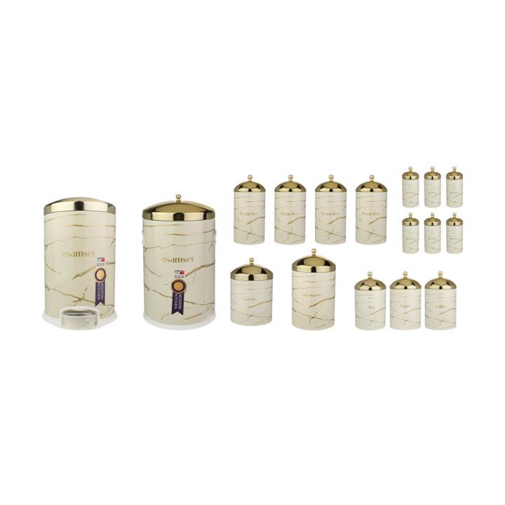 اقلام سرویس 17 پارچه استوانه ماربل :\r\n سطل پدالی متوسط آرام بند ، جا برنجی متوسط ، سطل قند ، سطل شکر ، جاحبوبات 1/5 کیلویی (4عدد)\r\nپاسماوری 1 کیلویی ( 3 عدد) ، ست ادویه 6 پارچه با درب گنبدی