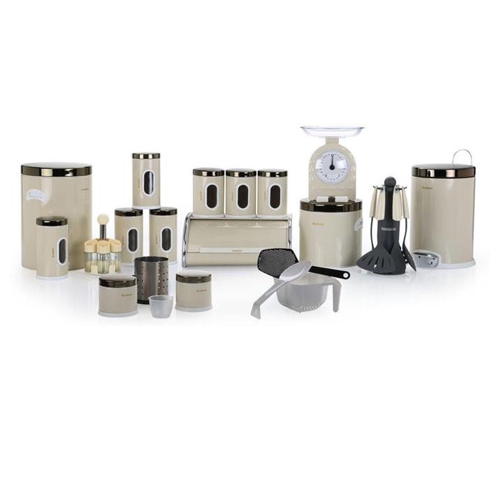 آبکش, دستکش آشپزخانه, رنده هفت کاره, روغن گیر, زیر قاشقی, سرویس ادویه یک طبقه, سرویس جای نان, سطل برنج, سطل زباله پدال دار, سطل قند بلند, قوطی حبوبات پنجره دار 4 عددی, کفگیرو ملاقه