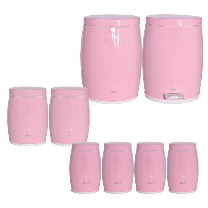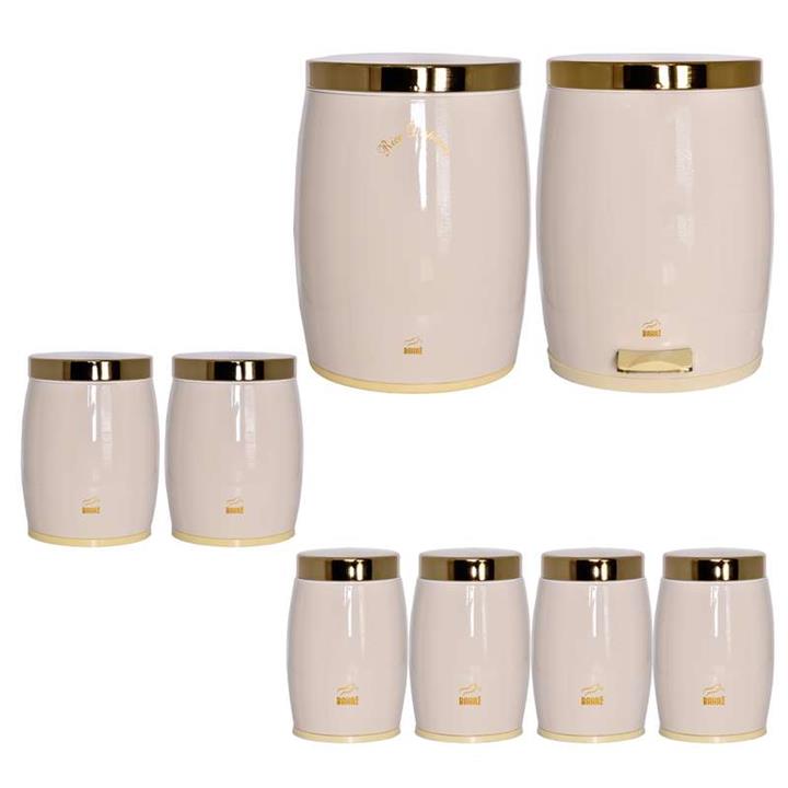 این ست شامل : 1 عدد سطل زباله ، 1 عدد سطل برنج ، 1 عدد سطل قند ، 1 عدد سطل شکر، 4 عدد جا حبوبات