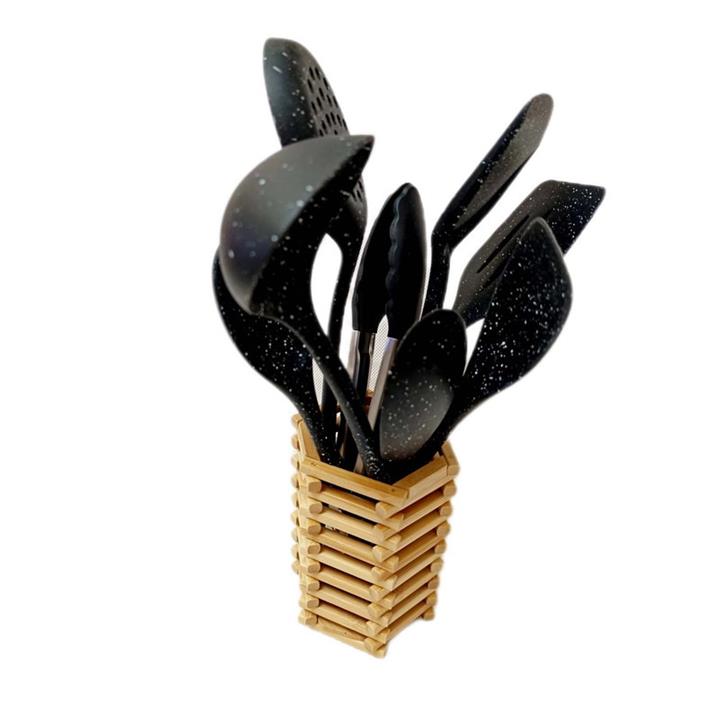 شامل انبر سیلیکون قفل دار, قاشق28.6 و کفگیر ساده 32.9و کفگیر سوراخ دار32.9 و کفگیر شیاردار30.8 ,ملاقه 32.9و کفگیر پارویی دسته کوتاه22.7 و کفگیر لیسکی 28.6 جا قاشقی بامبو