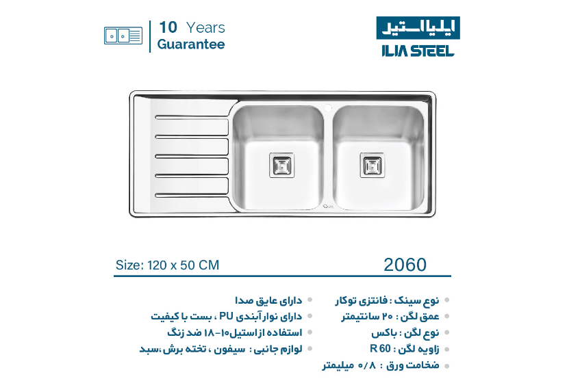 مشخصات فنی سینک ظرفشویی ایلیا استیل Ilia Steel مدل 2060 توکار
