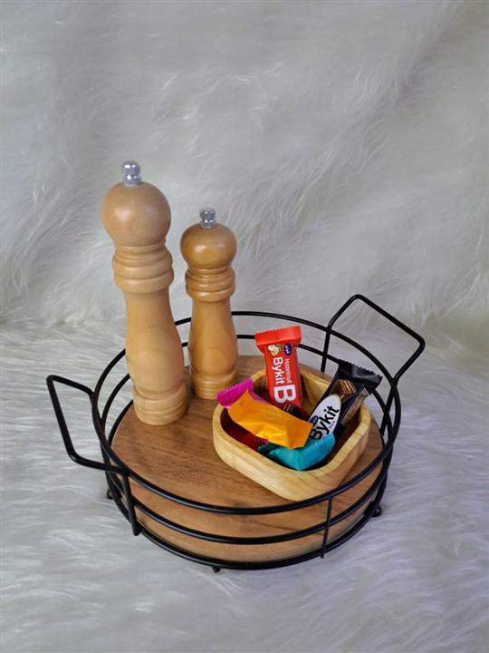 سینی چوبی دسته فلزی گرد مدرن( سرویس پذیرایی کامل شامل ست استند مزه، ظروف 5 تکه و شمعدان در غرفه موجود است)