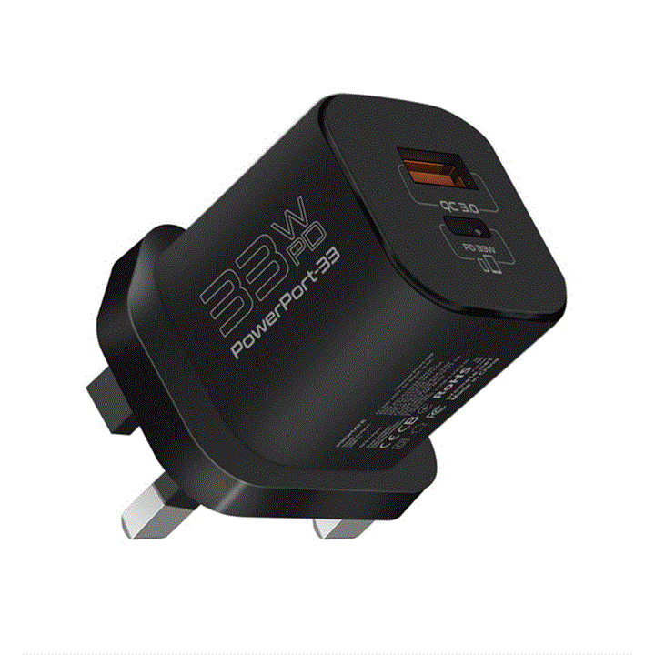 فوقالعاده جمعوجور: 50 درصد کوچکتر از شارژرهای مبتنی بر سیلیکون\r\nورودی: AC 100-240V, 50-60Hz, 0.6A\r\nخروجی کل: 33 وات\r\nخروجی پورت USB-A: 22.5 وات با فناوری QC 3.0، 5V/4.5A, 3.6-6V/3A, 6-9V/2A, 9V-12V/1.5A\r\nخروجی پورت USB-C: 33 وات با فناوری PD 3.0، 5V/3A, 9V/3A, 12V/2.5A, 15V/2A, 20V/1.5A\r\nخروجی دوگانه: C A: 5V/4.5A (22.5 وات)\r\nمحتویات بستهبندی: PowerPort-33، راهنمای کاربر\r\nگواهینامهها: RoHS, CE, CB, FCC, EAC