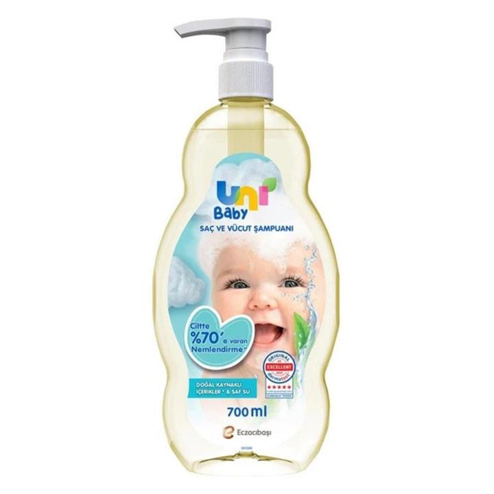 شامپو سر و بدن کودک یونی بیبی Uni Baby با فرمول مخصوص جدید ، بوی مطبوع و ساختار نرم مو و پوست سر کودک را تمیز و محافظت می کند.این محصول باعث سوزش و اشک چشم نمیشود و حمامی لذت بخش برای کودکان ایجاد می کند. ترکیبات شامپو بچه یونی ضد حساسیت می باشد که علاوه بر کودکان، برای بزرگسالان در شرایط خاص و برای برخی بیماری ها قابل استفاده است.شامپو کودک یونی بی بی معطر بوده و تا مدت زمان طولانی موی کودک را خوشبو نگه میدارد. ترکیبات این شامپو فاقد پارابن و مواد نگهدارنده است. شامپو بچه یونی بی بی موهای کودکان را نرم و براق میسازد و غلظت مناسب آن نیاز به مصرف زیاد آن را کاهش داده و به صرفه است. این محصول در بسته بندی 700 میلی لیتری عرضه شده است. این محصول فاقد مواد آلرژی زا بوده و با فرمولاسیون جدید خود باعث تمیزی و نرمی و لطافت هرچه بیشتر موهای فرزند دلبندتان می شود\r\n\r\n