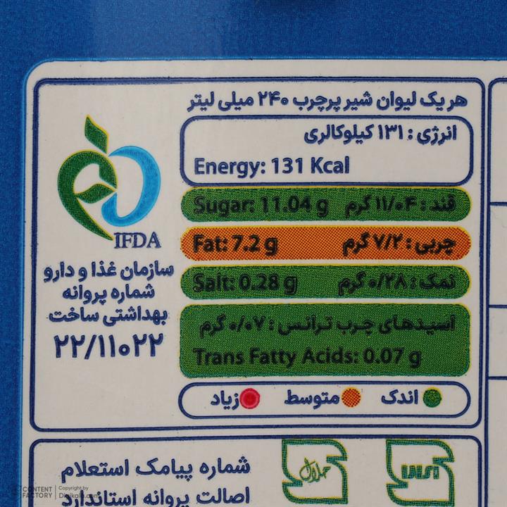 هر یک لیوان شیر پرچرب 240 میلی لیتر:\r\n- انرژی: 131 کیلوکالری\r\n- قند:11.04 گرم\r\n- چربی:7.2 گرم\r\n- نمک:0.28 گرم\r\n- اسیدهای چرب ترانس70.04 گرم