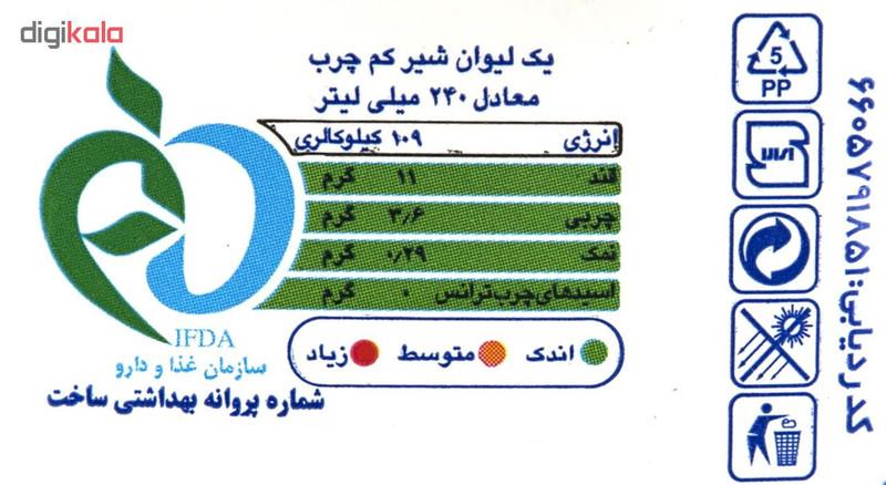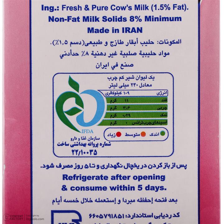 - ترکیبات: شیر تازه گاو با چربی 1/5 درصد و غنی شده با ویتامین D\r\nشیر کم چرب بسته 4 عددی \r\nارزش غذایی در 240 میلیلیتر (یک لیوان شیر کمچرب):\r\n- انرژی: 109 کیلوکالری\r\n- قند: 11 گرم\r\n- چربی: 3.6 گرم\r\n- نمک: 0.29 گرم\r\n- اسیدهای چرب ترانس: 0 گرم