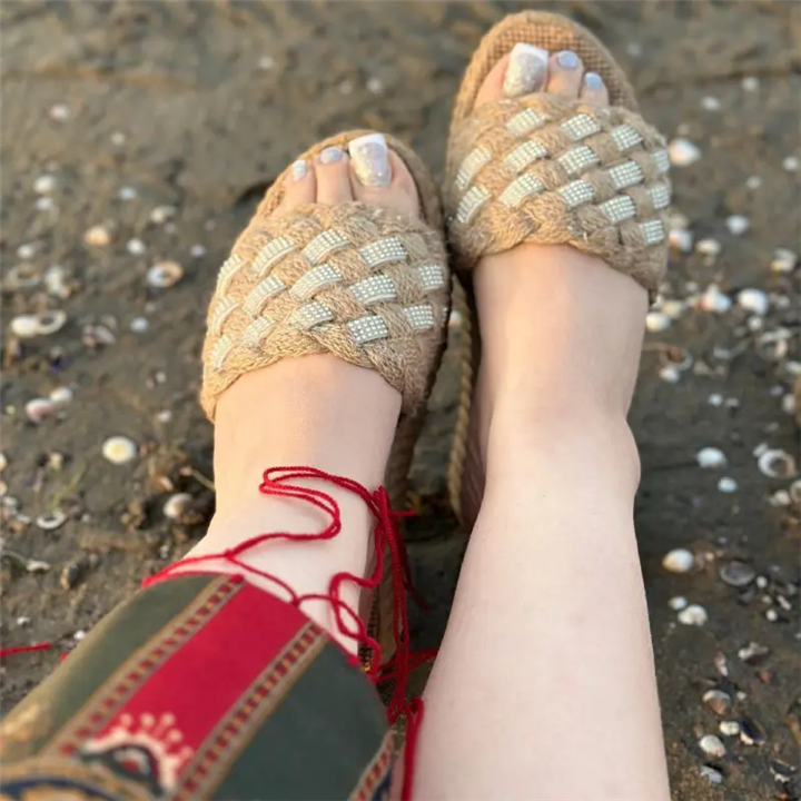 مشخصات فنی صندل لژدار کنفی زنانه نگینی