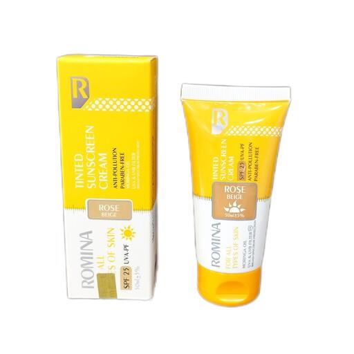کرم ضدآفتاب رنگ بژ طبیعی SPF 50 رومینا حجم 50 میل\nROMINA TINTED SUNSCREEN FOR ALL TOYPS OF SKIN
