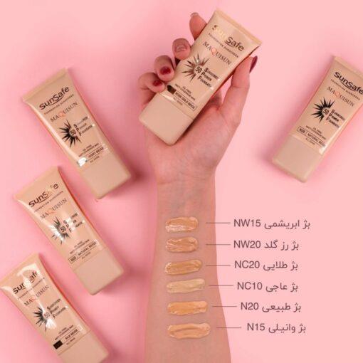ضد آفتاب رنگی کرم پودری و پرایمری فاقد چربی SPF 50 مکیسان سان سیف ( رنگبندی )