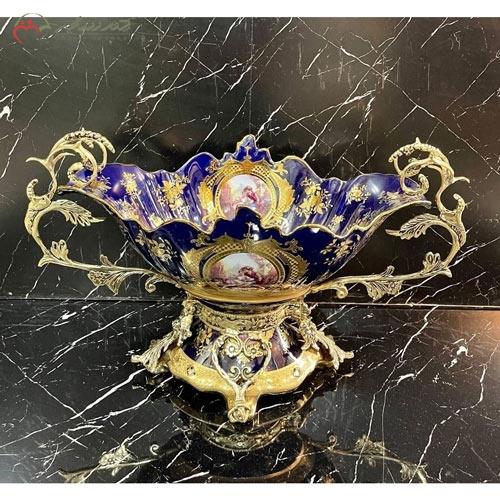 ظرف کشکول ترکیبی برنز و چینی سلطنتی سرمه ای و طلایی رنگ
