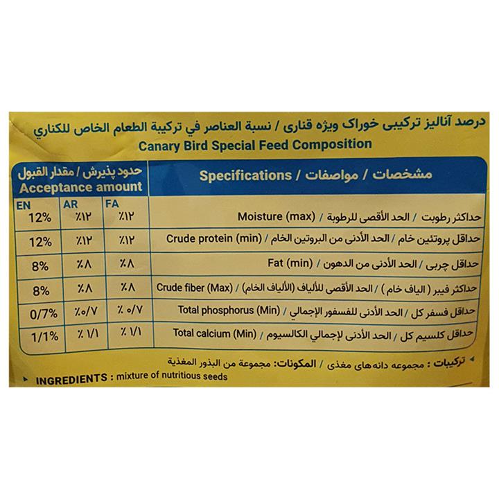 مشخصات فنی غذا قناری سپهردانه مدل دانه های مغذی وزن 1 کیلوگرم